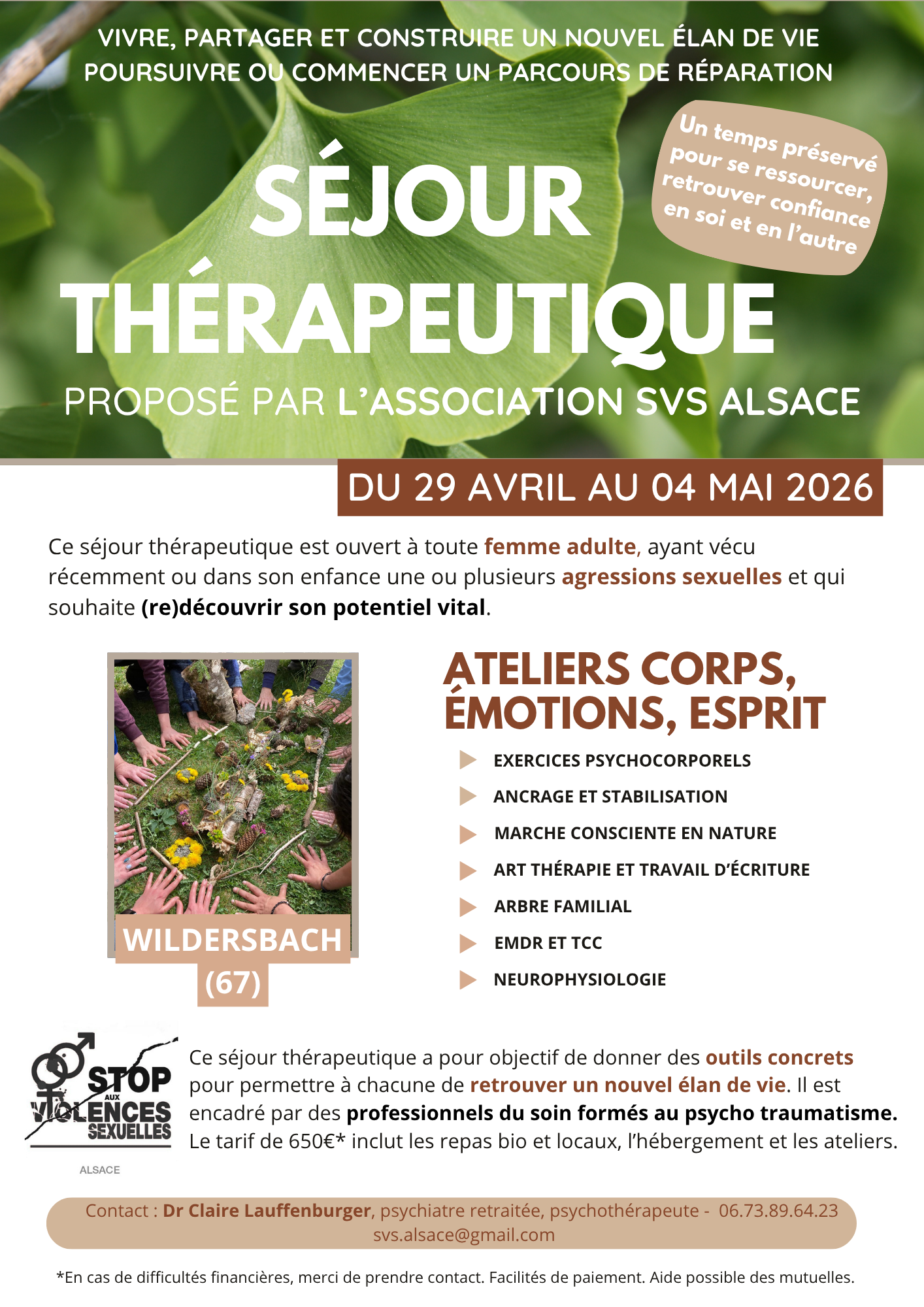 Ce séjour thérapeutique est ouvert à toute personne adulte, ayant vécu récemment ou dans son enfance une ou plusieurs agressions sexuelles et qui souhaite (re)découvrir son potentiel vital.